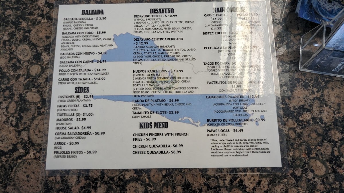 The menu offers a delightful selection, with kid-friendly options like Quesadilla De Queso for just $8.35. For breakfast enthusiasts, the Desayuno Tipico features a delightful combination of tamal, eggs, cheese, and fried plantain at $13.50, available all day. Main dishes like Bistec Encebollado ($19.49) and Carne Asada ($19.49) are also highlights, each served with sides to complement the robust flavors.
